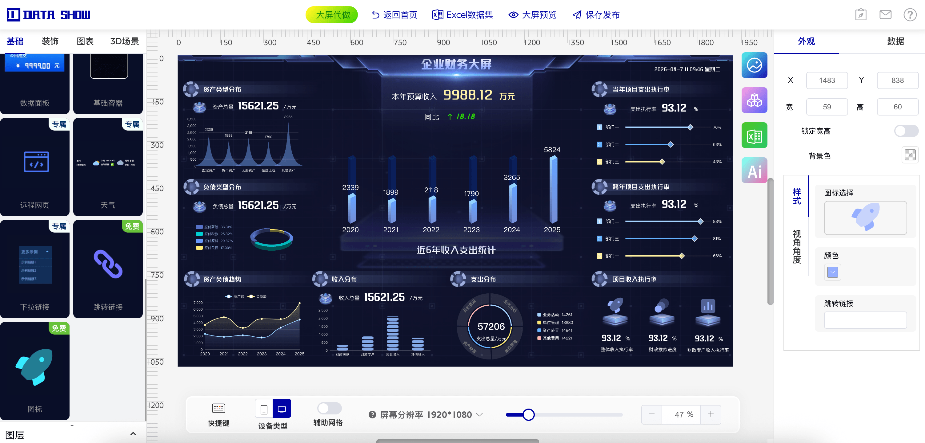 DataShow可视化大屏编辑器,支持拖拽配置图表、组件、布局等,支持自定义静态数据和配置api动态数据、一键发布、让零基础的用户也能轻松制作出专业的大屏、移动端数据看板。