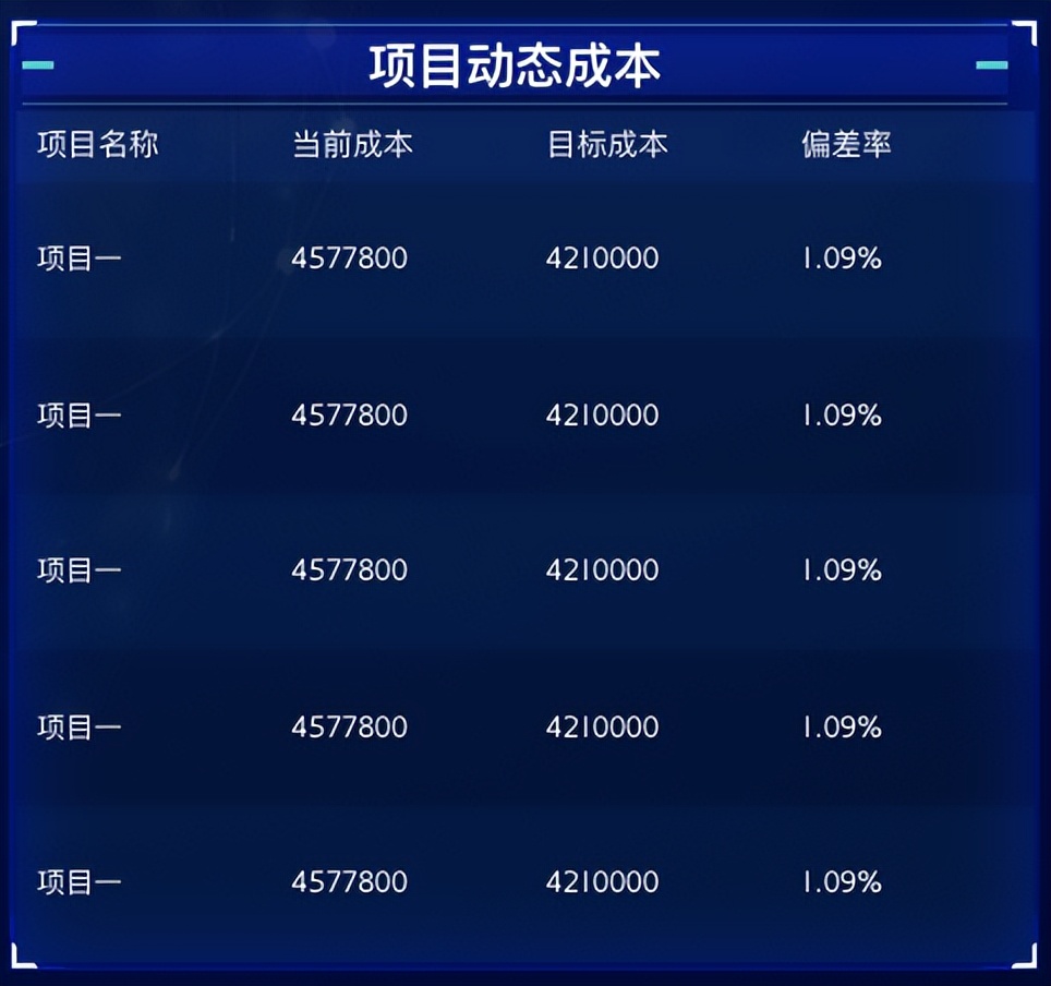 - 使用轮播表格展示每个项目的当前成本、目标成本和偏差率。