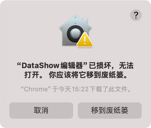 下载并解压 DataShow 编辑器后,部分 macOS 用户可能会遇到系统安全提示:“‘DataShow编辑器’已损坏,无法打开。你应该将它移到废纸篓。”