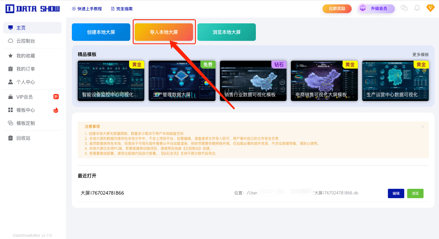 ⚠️注意:此功能仅在客户端软件上开放,只支持本地数据大屏的代码导出,钻石会员及以上解锁此功能