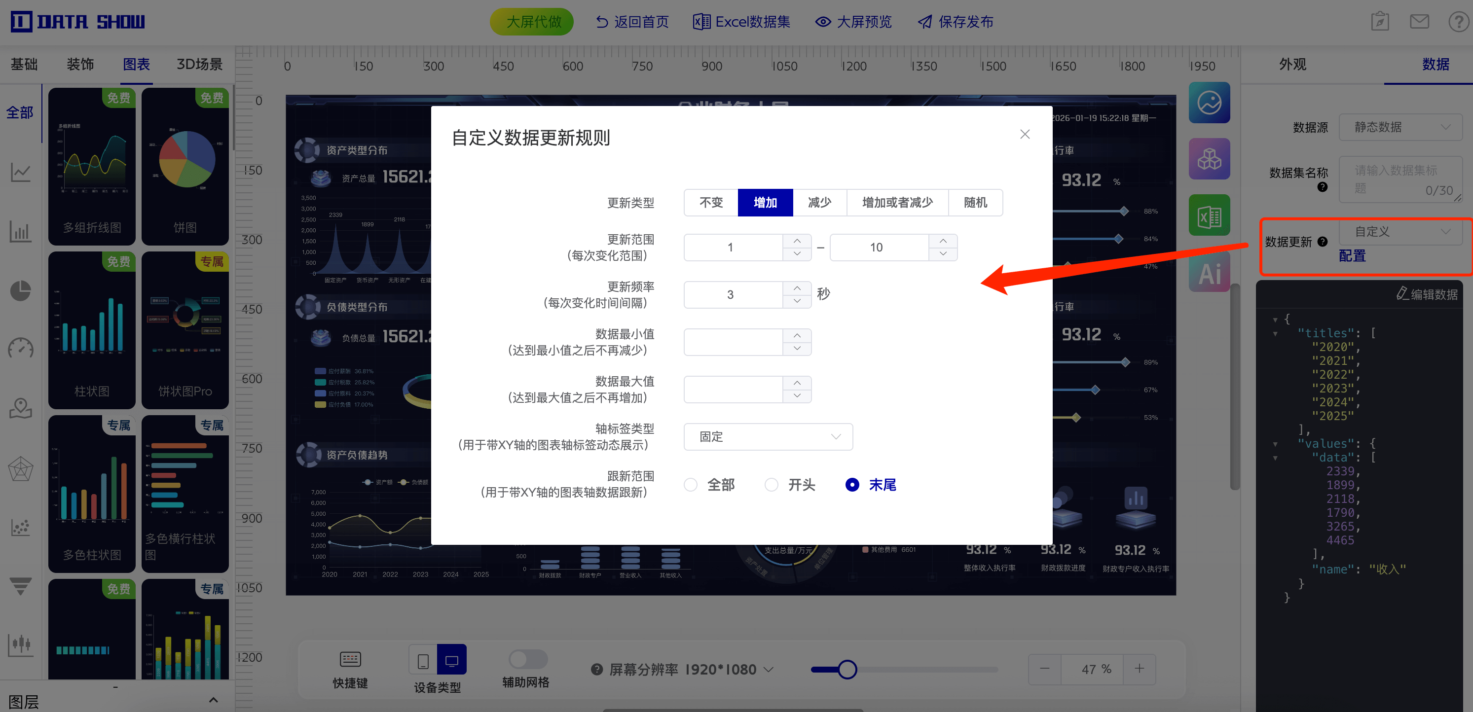 它支持在线拖拽搭建大屏,内置上百套模板,基础功能免费使用,高级功能按需订阅、无隐形收费。更重要的是,它提供强大的虚拟动态数据配置能力,无需真实 API,也能让数字跳动、图表流动、时间轴实时更新,完美满足演示与展示需求。