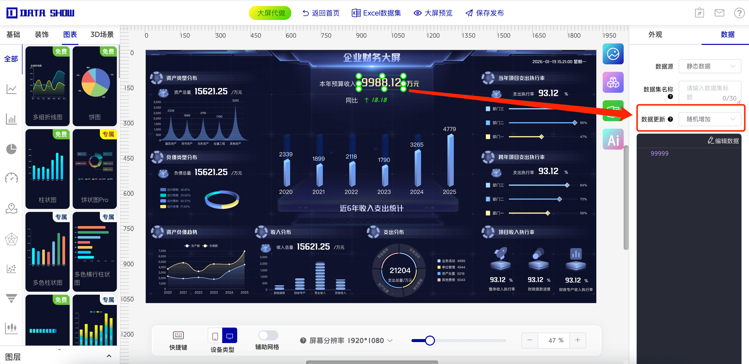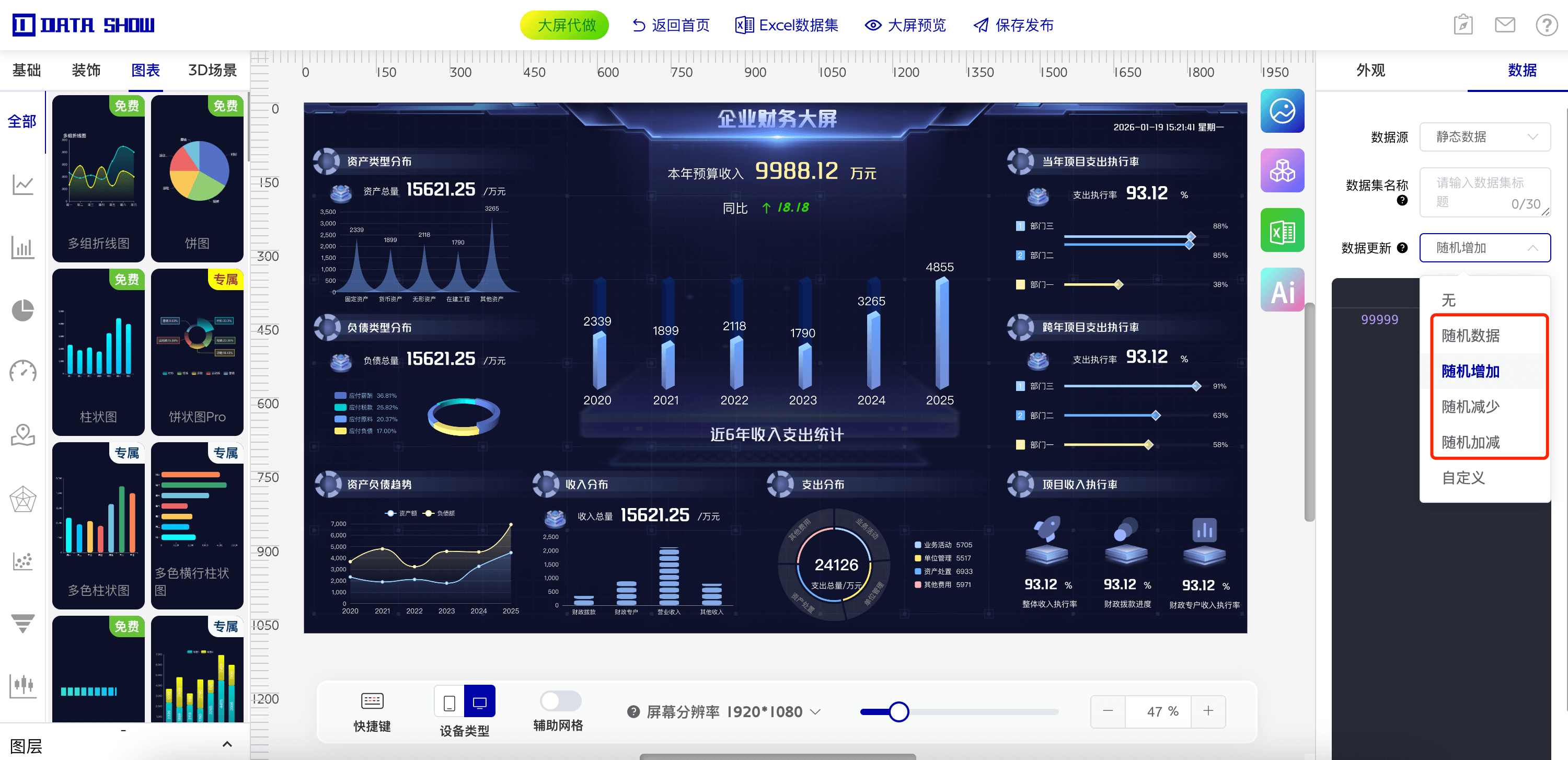 通过 DataShow 的虚拟动态数据功能,你可以在不依赖真实接口的情况下,轻松制作出具有专业动感的数据大屏。无论是展会演示、教学案例,还是内部汇报,都能以极低成本实现高视觉价值。
